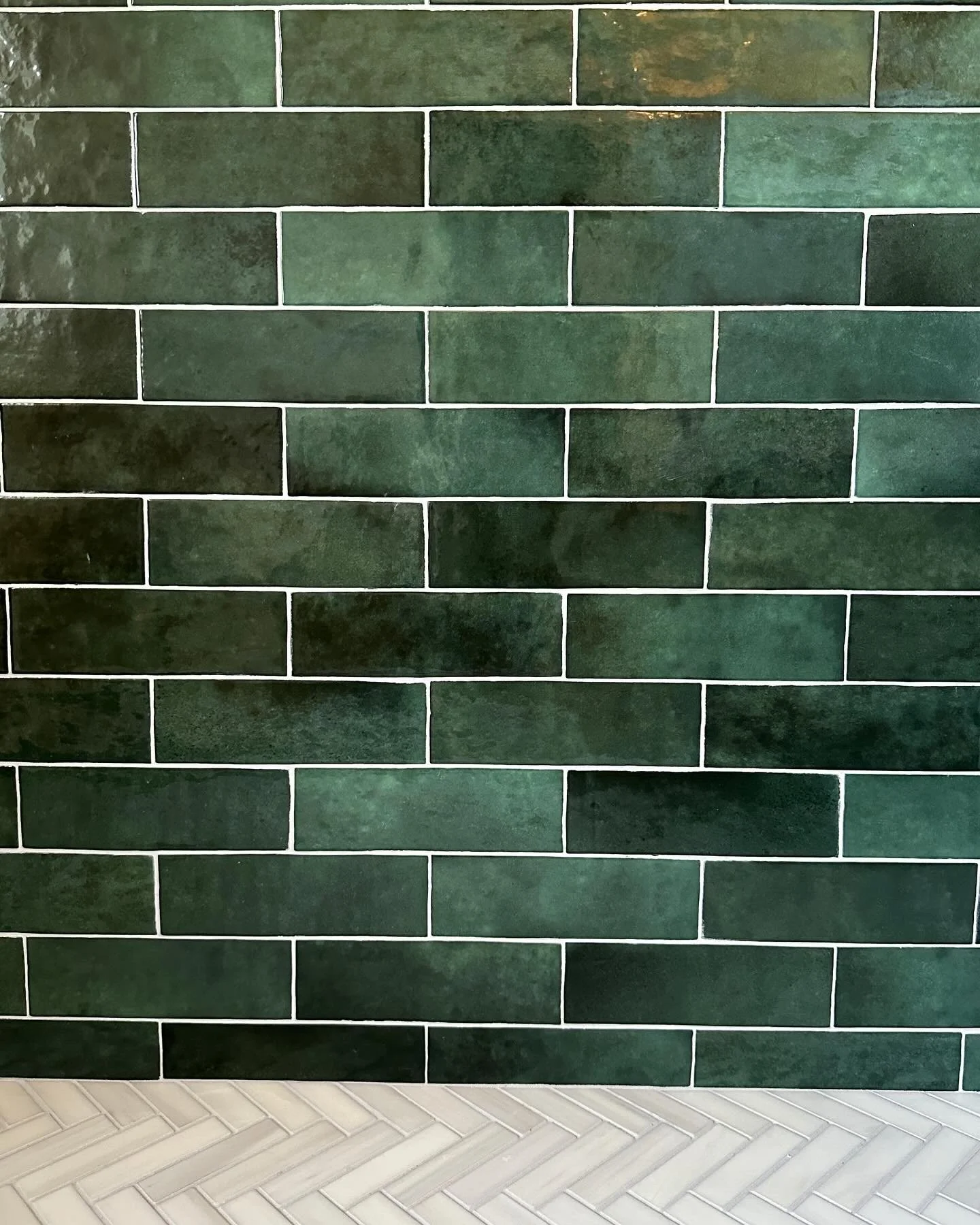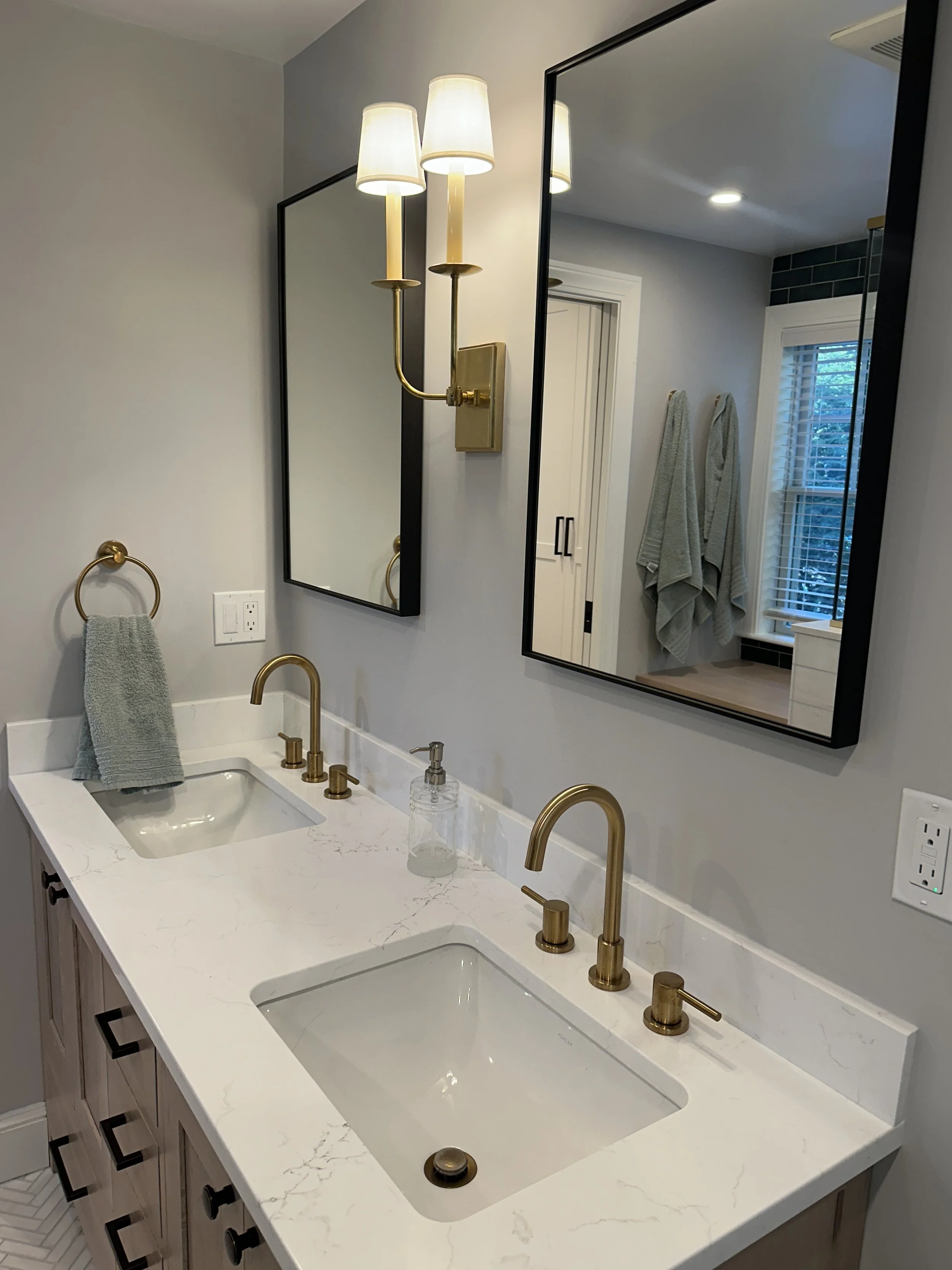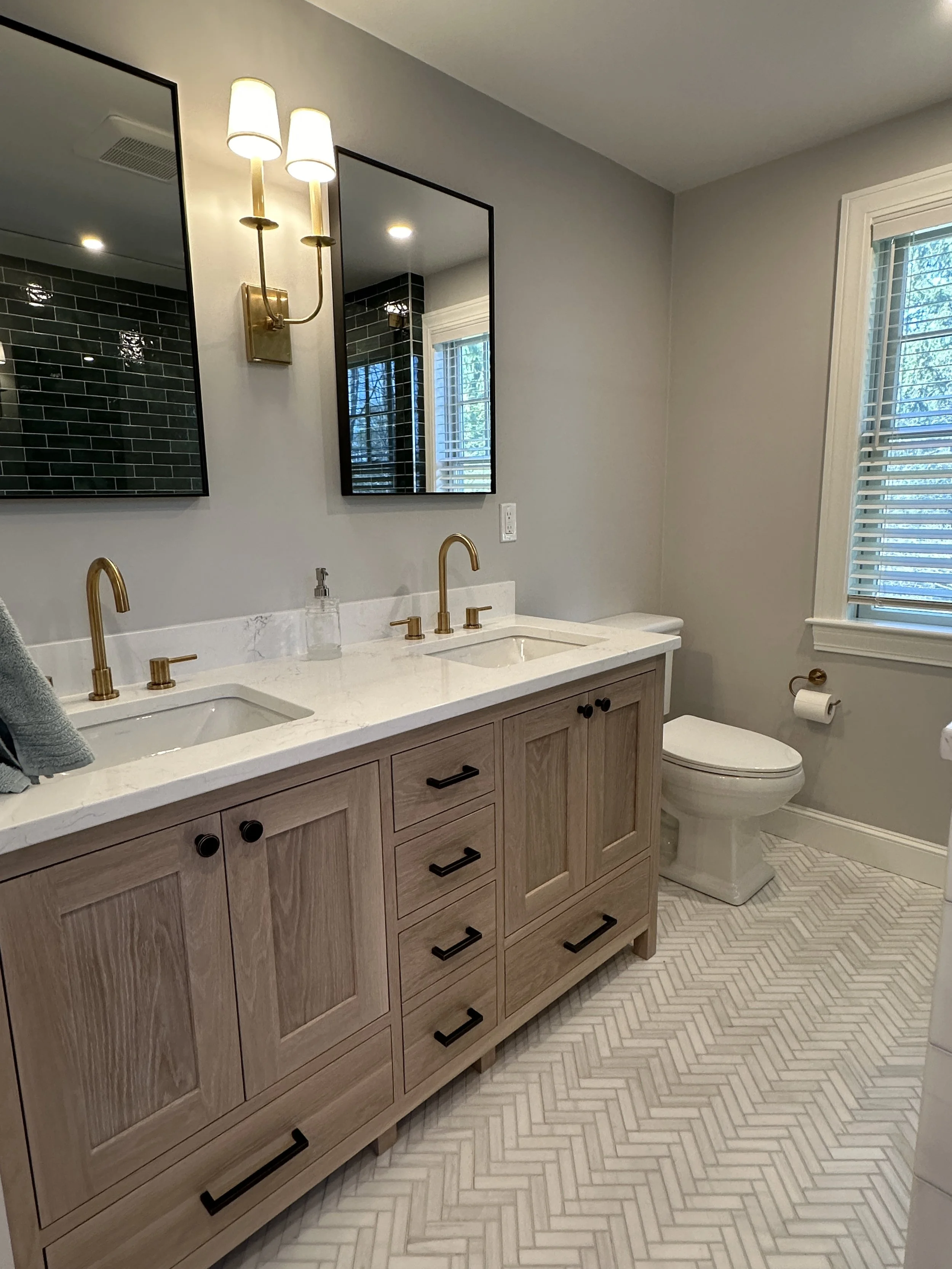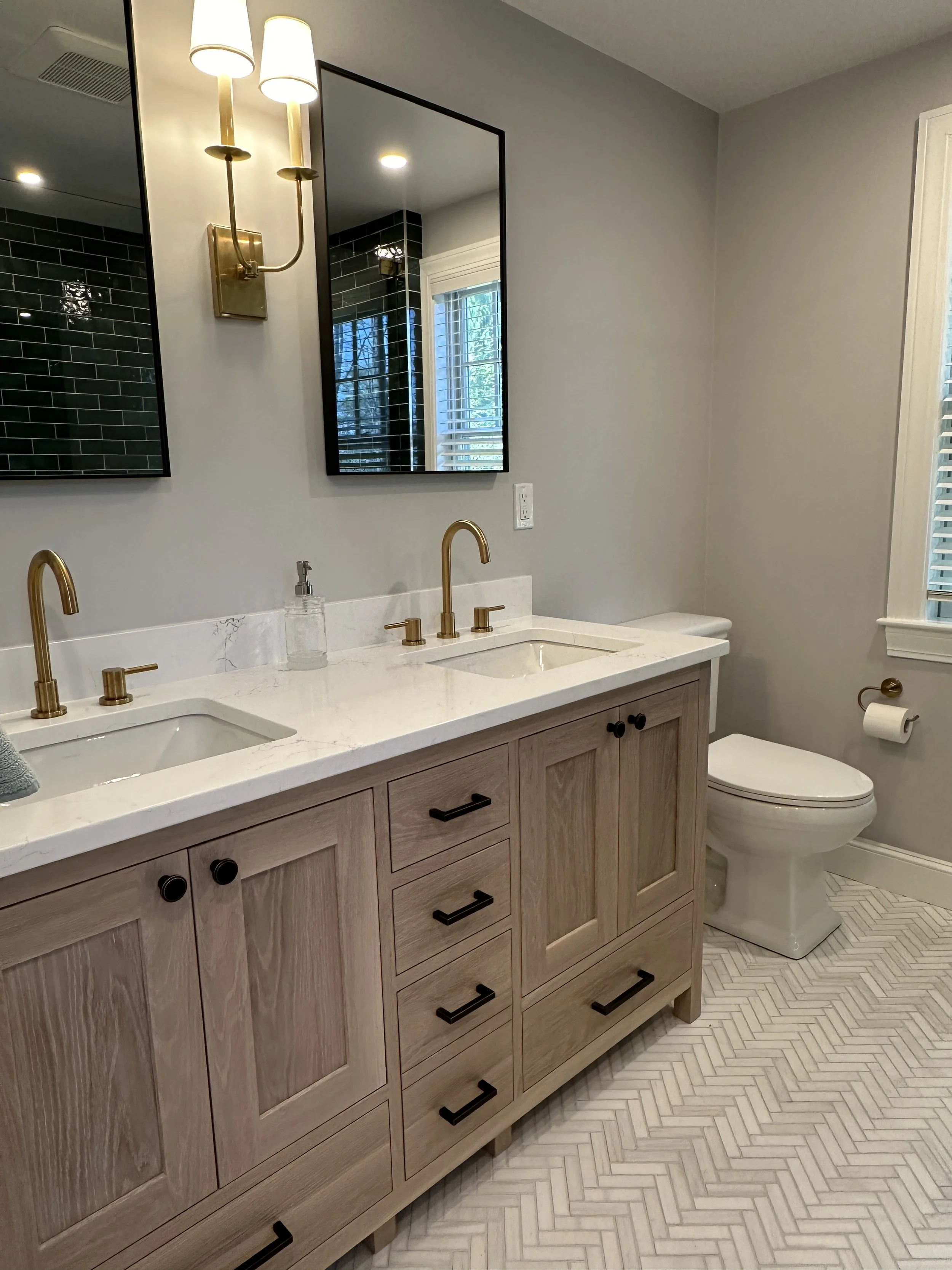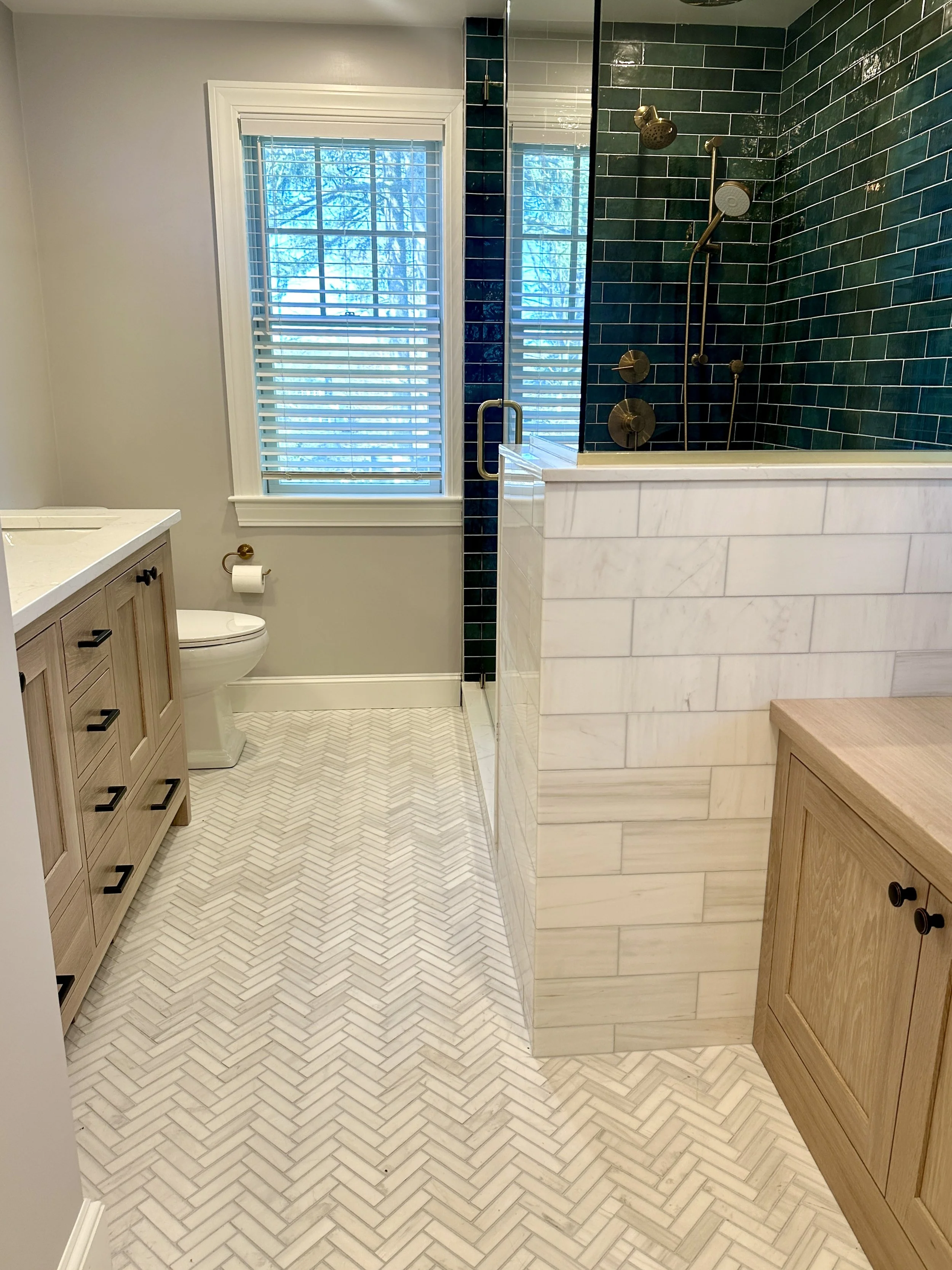 In the bathroom, our design included a custom vanity in white oak, marble tile in a herringbone pattern, green shower tile from Bedrosian Tile, and oil-rubbed bronze fixtures.