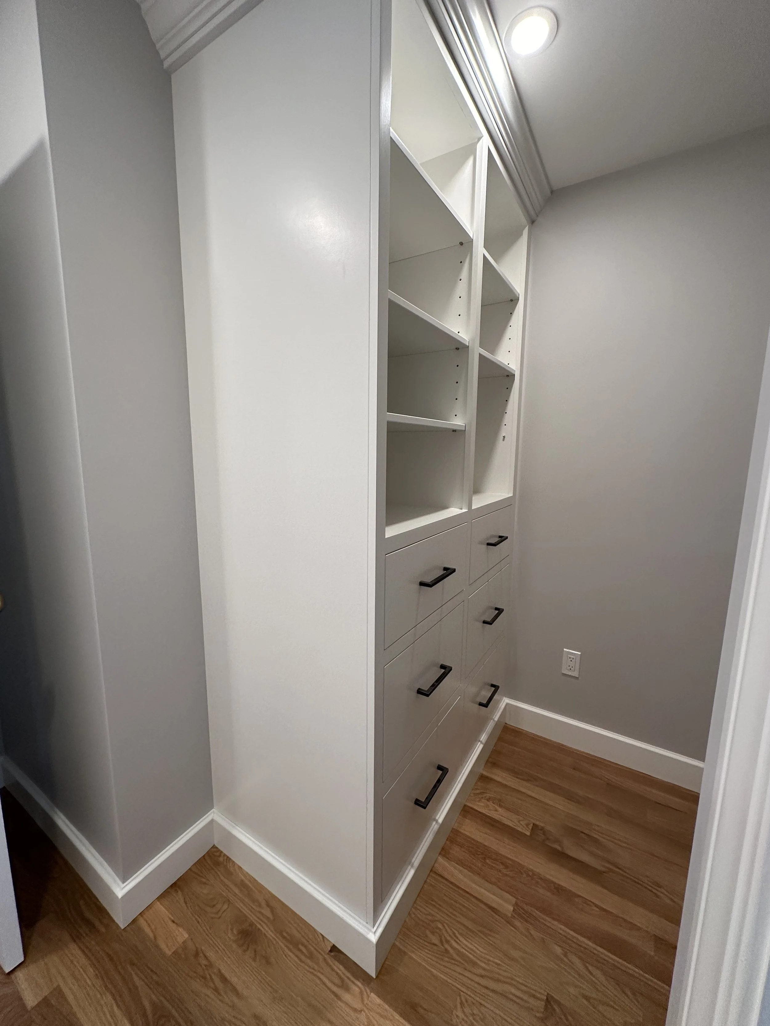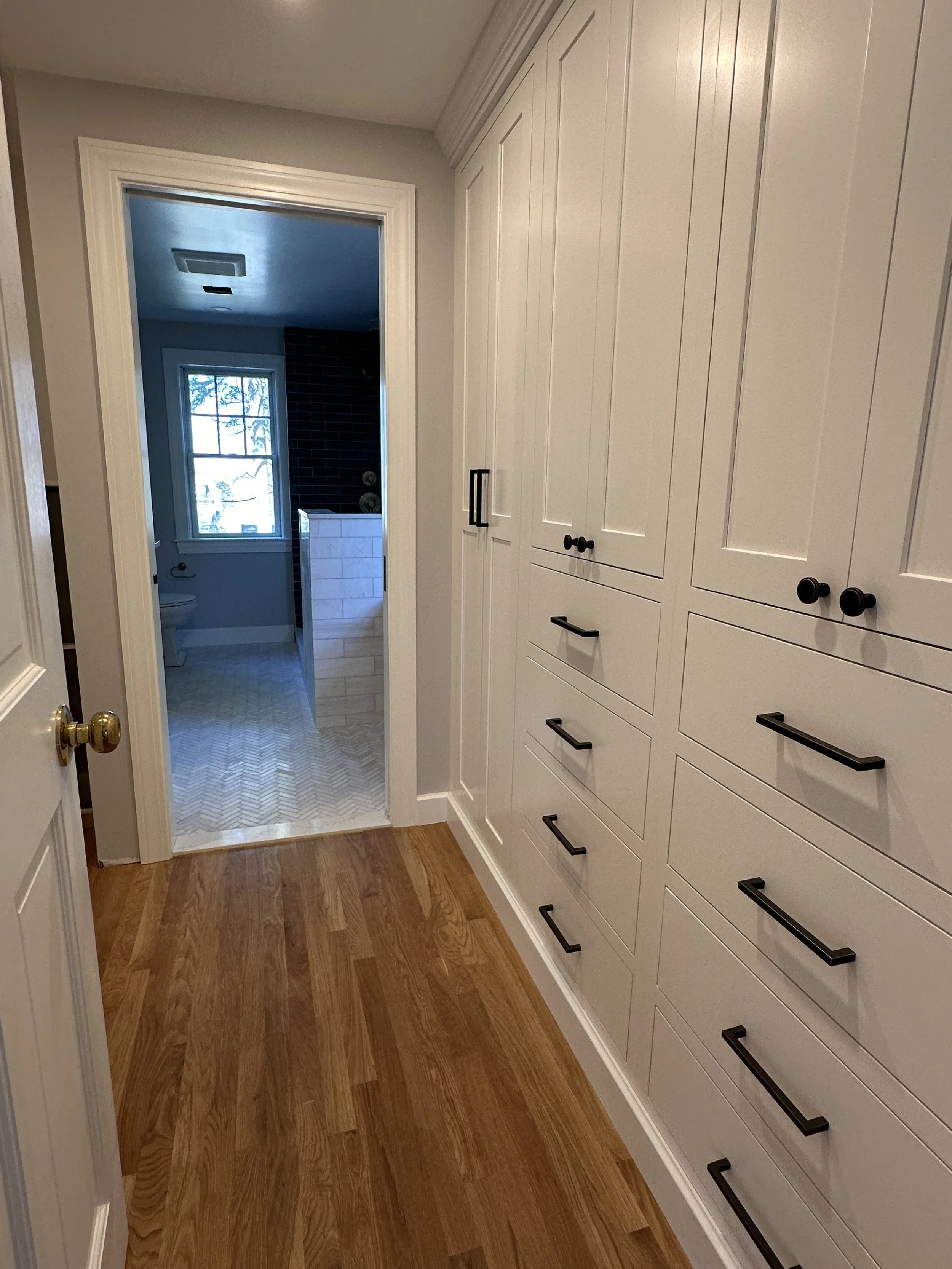 We love the transformation of this primary bathroom in Swampscott. In addition to the bathroom, we redesigned the closets and installed custom cabinets and storage solutions.