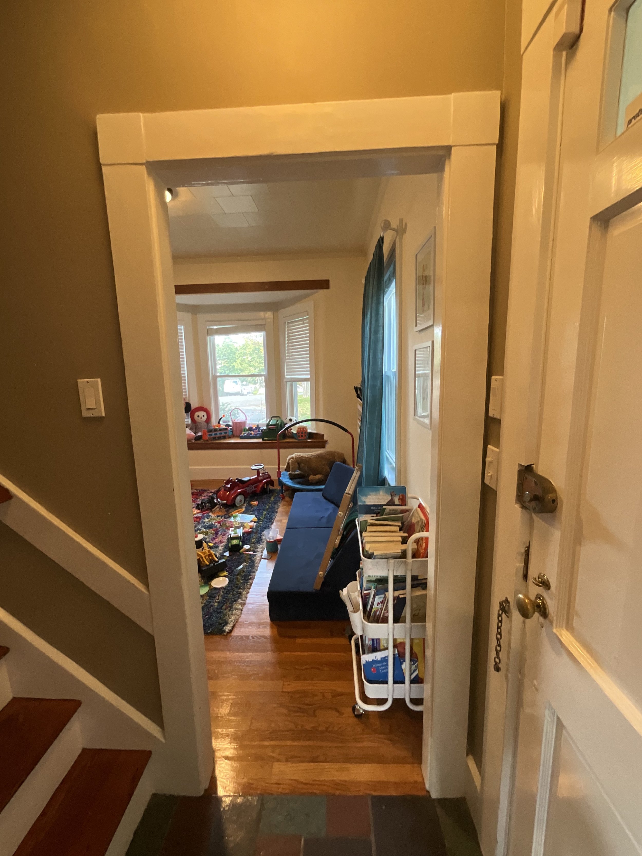 Removed all the walls, flooring and ceiling down to the studs on the first floor including the entryway, kitchen, dining room, and walk-in pantry.