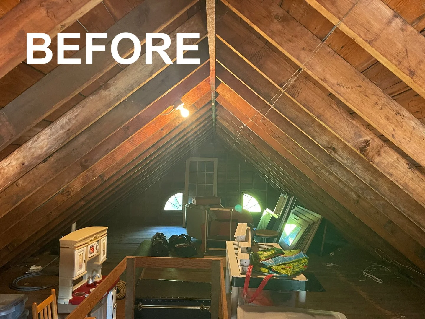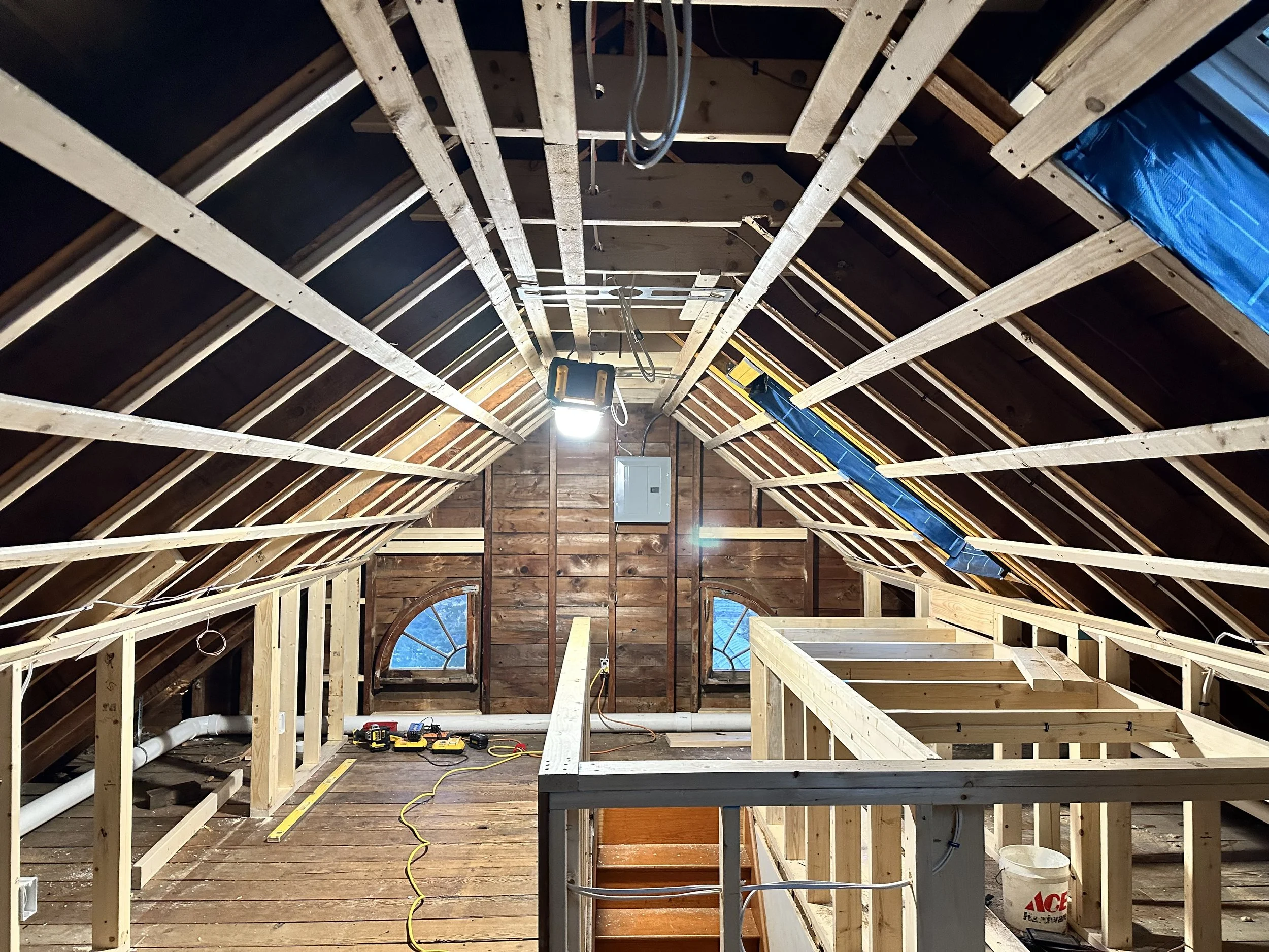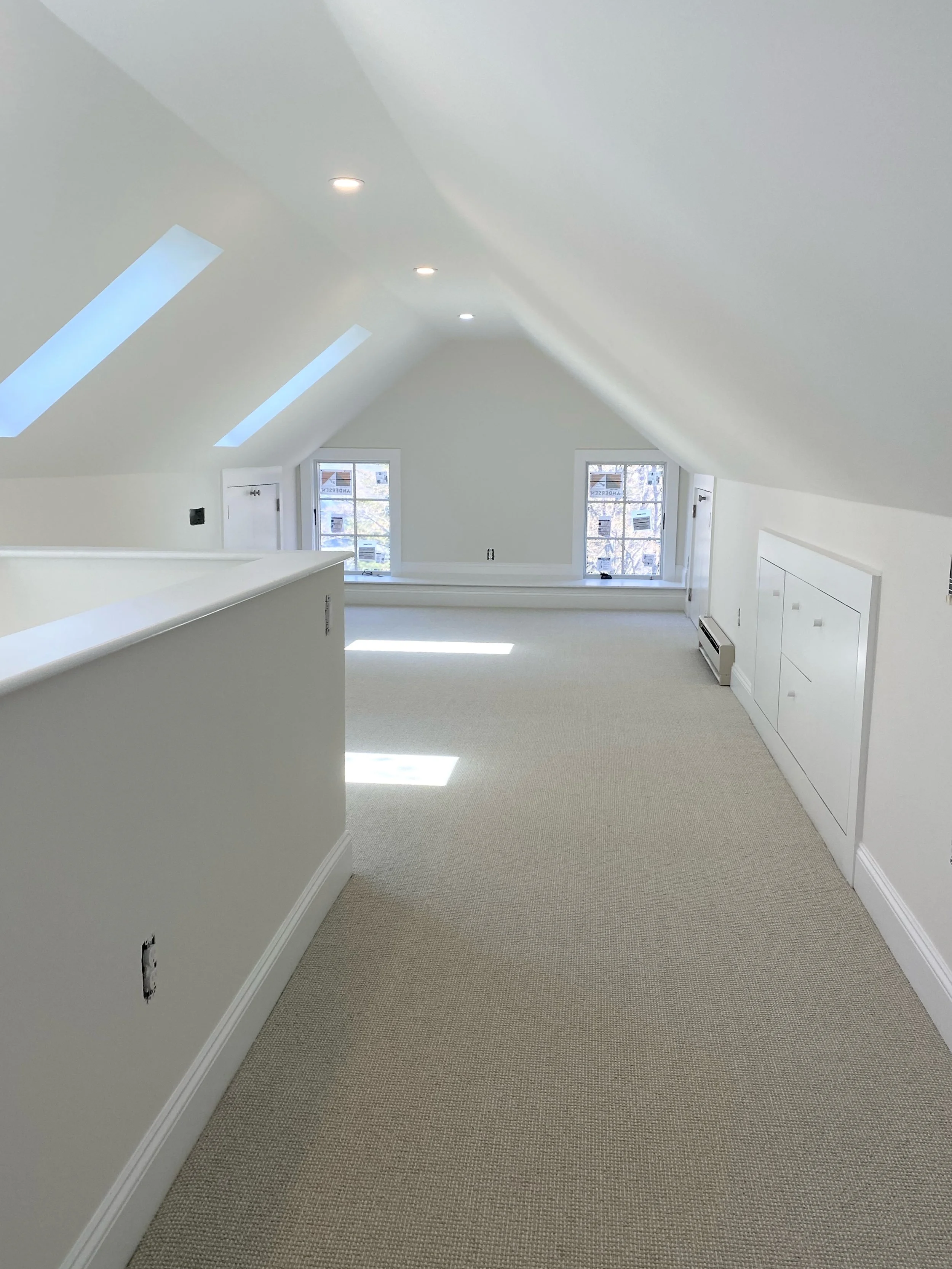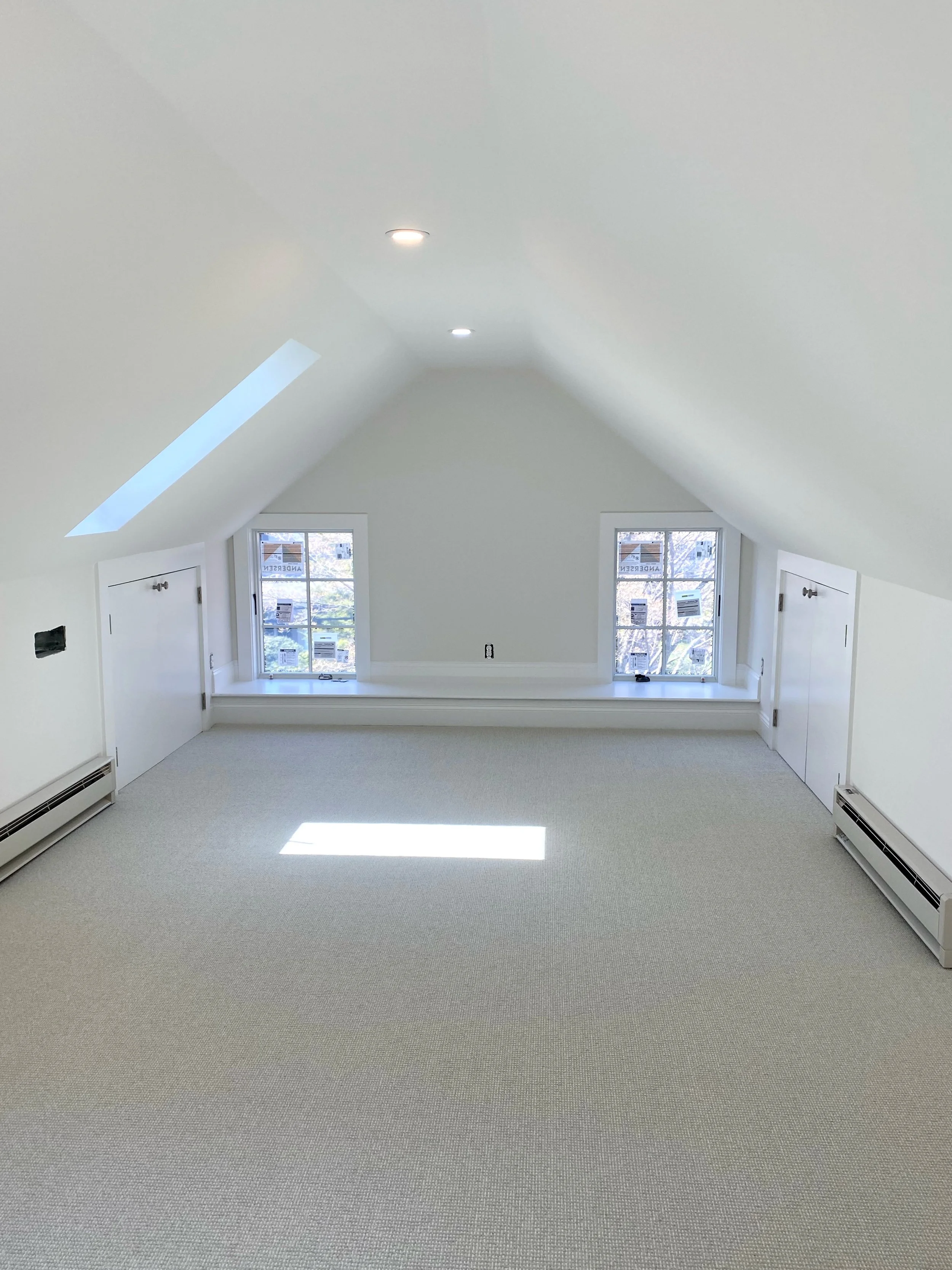 Our design included framing the space so it could be used as an office. We added Velux skylights to bring in more natural light, replaced the windows, added a new cooling system, and added new insulation, baseboard electric heat, and wall-to-wall carpet to keep the space warm and cozy.